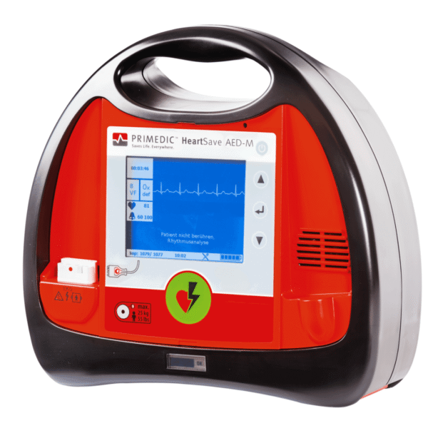 - The AED with illuminated monitor – here you can see the ECG, heart rate, number of shocks administered, duration of use, as well as voice instructions in text form.